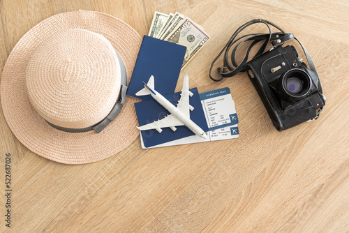 Flat lay composition with passport, toy plane and tickets on white wooden background, space for text. Visa receiving.