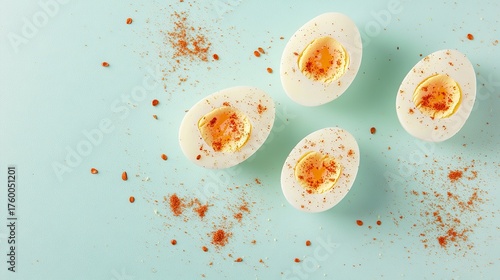 Flat lay of boiled eggs cut in half with paprika sprinkle,