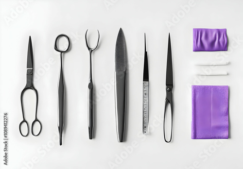 Flat lay of professional manicure tools, including scissors, cuticle pusher, nail file, tweezers, and purple cleaning cloths.