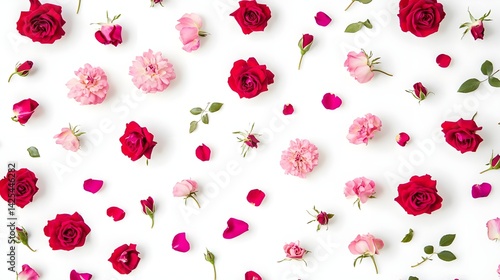 Flat Lay of Red and Pink Roses with Scattered Petals on White Background