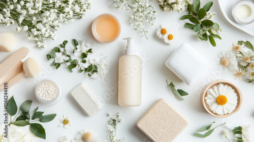 Flat lay photography of handmade products on a white background, clean and bright, high-resolution image