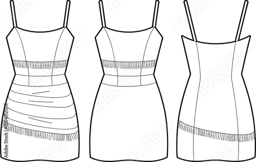 Flat Sketch of Fitted Mini Dress with Fringe Details and Spaghetti Straps – Fashion CAD Template for Trendy Women’s Eveningwear and Cocktail Dress Design