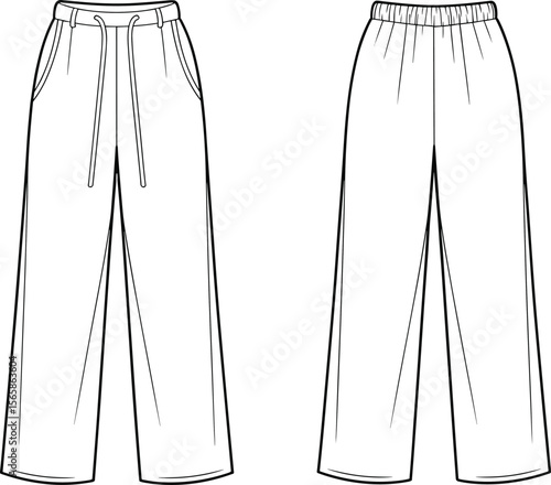 Flat sketch of women’s wide leg jogger pants with drawstring and elastic waistband, front and back CAD vector illustration