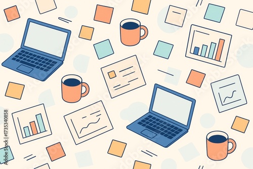 Flat style seamless pattern of laptops, charts, coffee cups, and documents in pastel colors on a light abstract background for business concepts. Ai generative