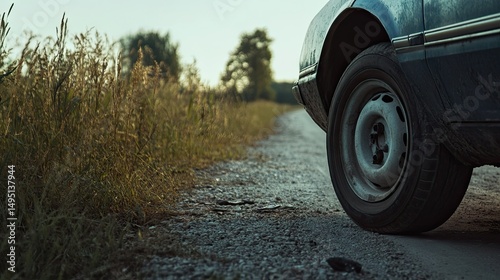 Flat tire on a car with a cracked rim, sitting on a gravel road in the countryside