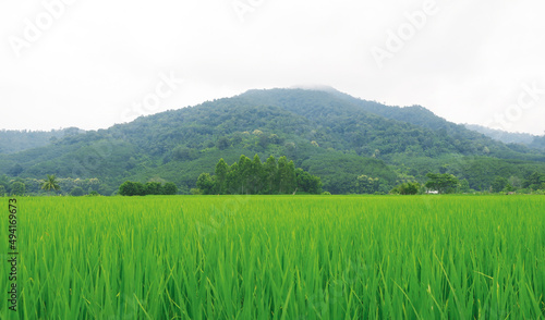 Flat top line of the green rice field with mountain background