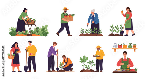 Flat Vector Gardening and Harvest Set - Diverse People Growing & Collecting Food
