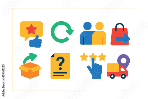 Flat vector icons of post-purchase engagement: leave review, reorder button, refer a friend, share purchase, return item, support ticket, rate experience, track delivery.
