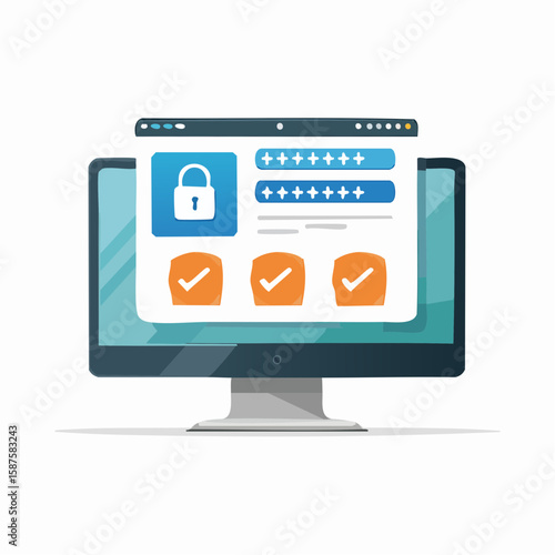 Flat vector illustration of a computer screen showing a secure login form, padlock icon, two-factor authentication message, digital protection concept