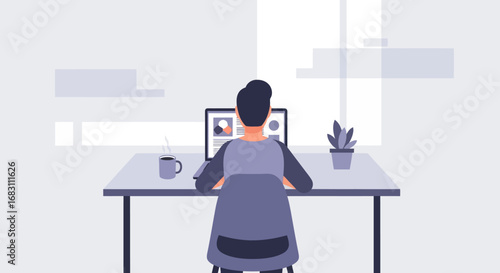 Flat vector illustration of a person working from home, sitting at a desk with a laptop, coffee, and plant by the window