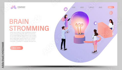 Flat vector landing page or web design men and women creating and brainstorming projects business concept