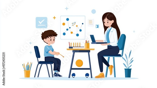 Flat vector of an autistic child in a classroom setting with sensory tools and a supportive teacher, on white background.