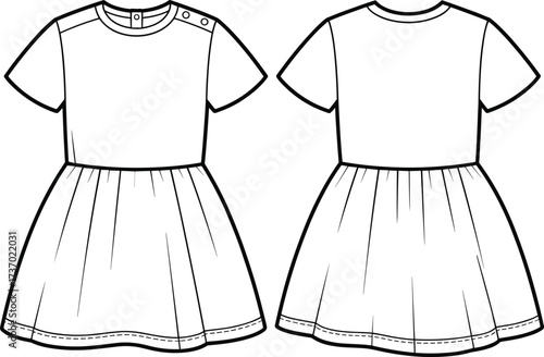 Flat vector short sleeve dress fashion sketch, front and back view, round neck, gathered skirt, children clothing design template illustration