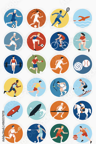 Flat Vector Sport Activity Icons and Athletic People Circle Set