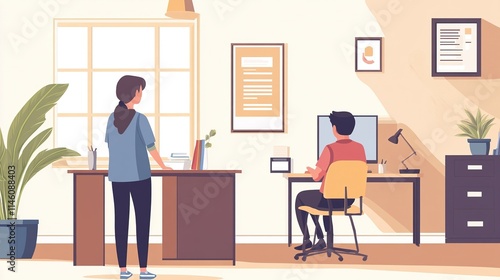 Flat vector style of a counselor helping a student in a school office.
