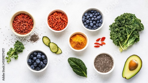 Flatlay of healthy superfoods including chia, kale and berries styled on light surface for clean minimal aesthetic