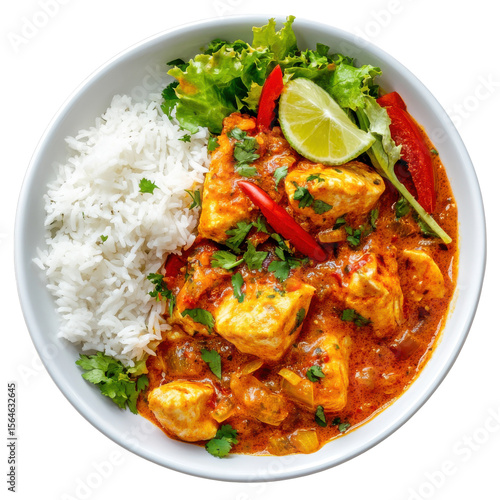 Flavorful Chicken Curry with Rice and Fresh Vegetables in a White Bowl on transparent background