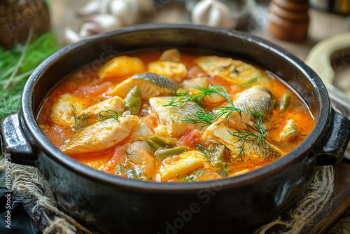 flavorful fish stew bouillabaisse served in rustic pot with fresh herbs on table