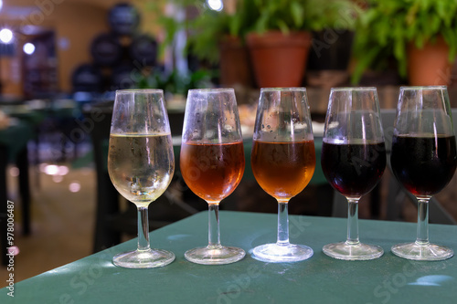 Flight of five sherry wine from barrels, fino, manzanilla, olorosso, amontillado, pedro ximenez jerez wines in old tavern, wine tasting, Sanlucar de Barrameda, Cadiz, Andalusia, Spain