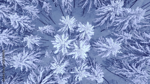 Flight over the top of snowy young pine trees in beautiful blue winter forest with no people Aerial video shot in 4K on UHD camera