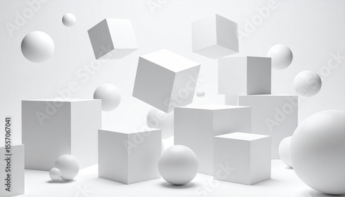 Floating 3D cubes and spheres in soft light gray on white canvas for modern presentation feel.