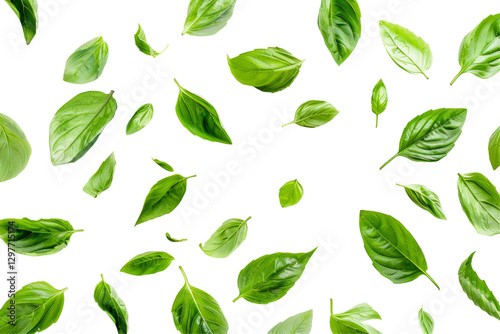 Floating Basil Leaves On Black. Fresh, Aromatic Herbs For Cooking. Food Photography Concept