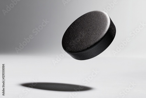 Floating black puck casts sharp shadow, emphasizing sleek design