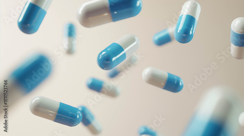 Floating blue and white medical capsules in minimal clean pharmaceutical background