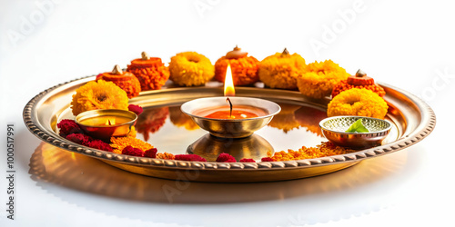 Floating Diya and Bhai Dooj Plate Concept: A Glowing Diya Above a Ceremonial Plate in Festive Celebration - Isolated on White Background, Captured with Circular Camera Movement