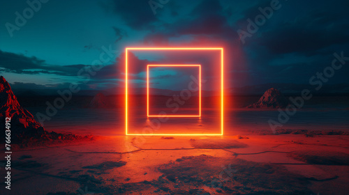 Floating glowing neon squares in a desert
