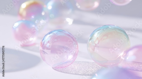 Floating Iridescent Spheres with Pastel Reflections on White Surface for Modern Abstract Design