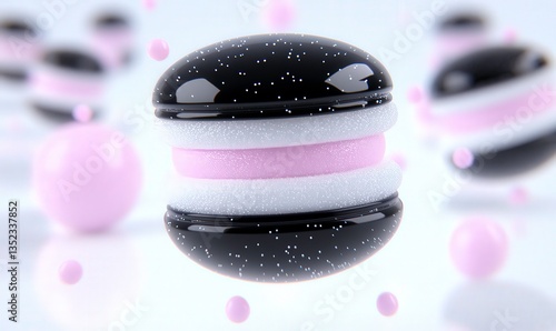 Floating Macaron Confectionery with Pink Cream Filling and Black Outer Layer Surrounded by Colorful Bubbles on a Soft Background
