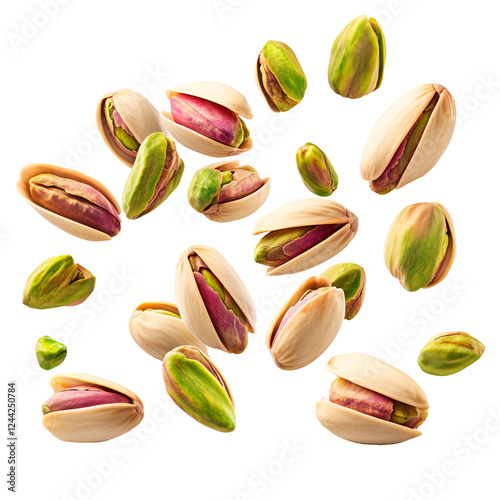 Floating pistachio nuts in shells and without shells, isolated on a transparent background. High-quality close-up of fresh green and brown pistachios, perfect for healthy eating, snacks.
