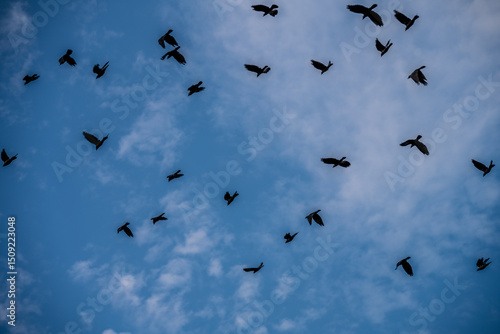 Flock of Birds Flying Against a Clear Blue Sky, Captured in Başiskele, Kocaeli, Türkiye