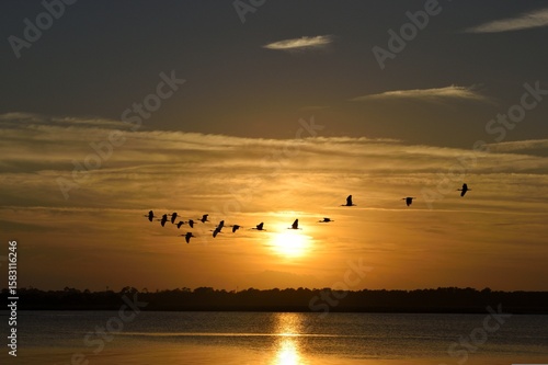 flock of Herons flying at sunset