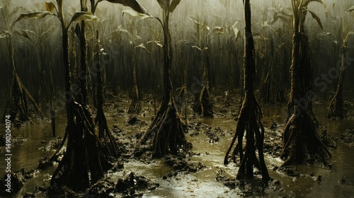Flooded cornfield, muddy roots, dark atmosphere, environmental disaster, stock photo