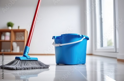 Floor mop and blue bucket for washing in room.