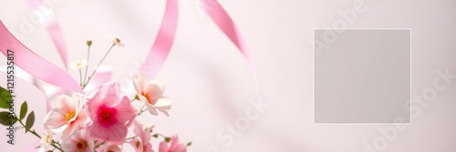 Floral arrangement with pink flowers and delicate ribbons creating a festive atmosphere representing celebration and joy against a soft, neutral background