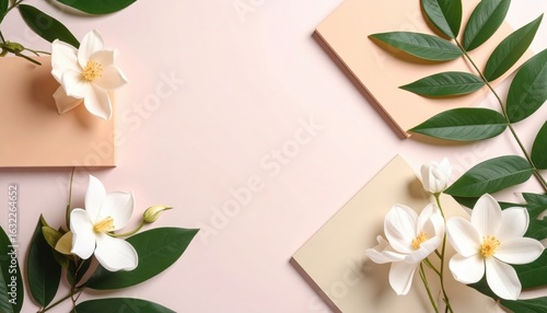 Floral arrangement with white flowers and green leaves on pastel background studio setting close-up nature inspired decor
