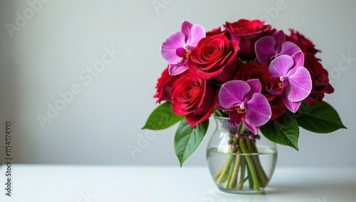 Floral bouquet with red roses and purple orchids, home decor, fresh cut flowers, red roses