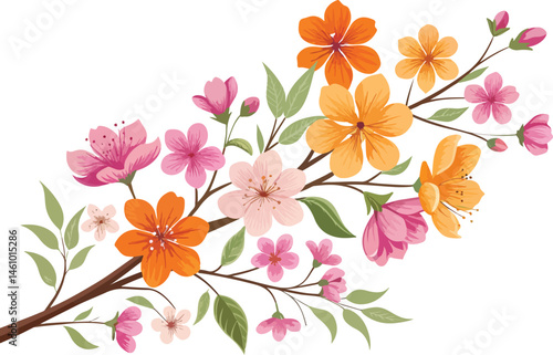 Floral branch with a mix of pink and orange wild flowers vector illustrations