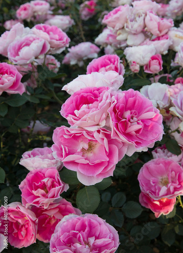 Floral. Closeup view of Floribunda hybrid Rosa Dynastie flower cluster of pink, fuchsia and white petals, spring blooming in the garden.