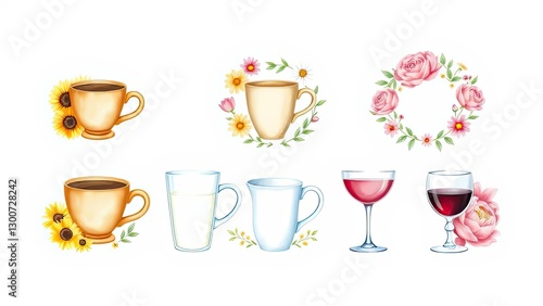 Floral Coffee Tea Milk Wine Cups Drinks Set Illustration