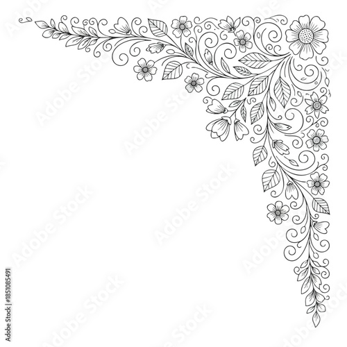 Floral corner design, with flowers, leaves, and swirls on white background