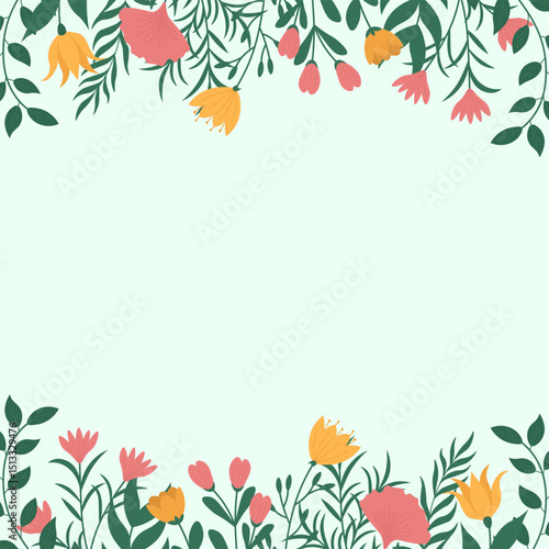 Floral frame background with spring flowers and leaves. Floral border for invitation or greeting card. Botanical illustration with pastel colors.