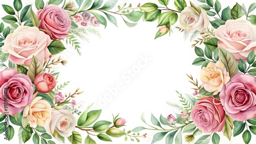 Floral frame with roses and decorative leaves. Watercolor wedding, invitation design. Floral elements, botanic watercolor.