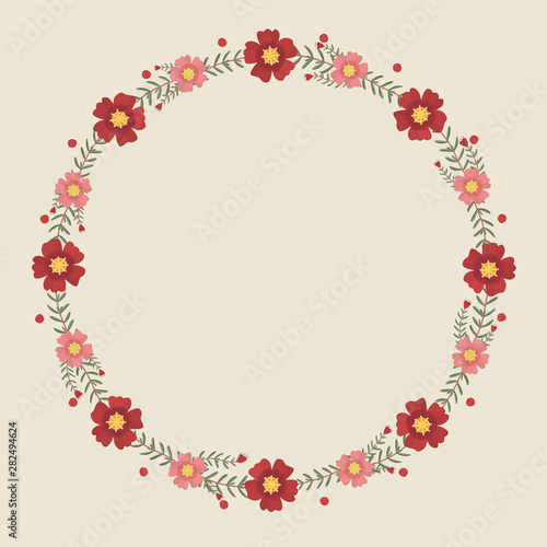 Floral greeting card and invitation template for wedding or birthday, Vector circle shape of text box label and frame, Red portulaca flowers wreath ivy style with branch and leaves.