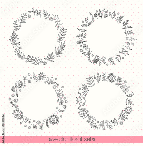 Floral ornate frame for invitations or announcements. Hand drawn flowers. Vector set