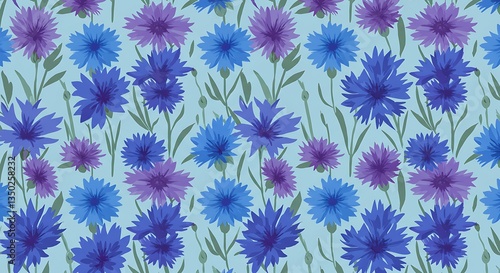 Floral Pattern Background Featuring Blue and Purple Cornflowers with Green Leaves