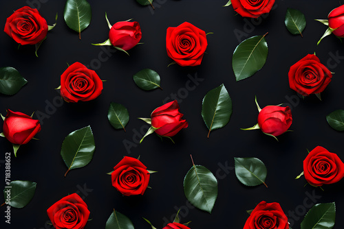 Floral pattern made of red roses, green leaves and petals on black background. Retro, vintage style. Love and romantic concept. Flat lay, top view